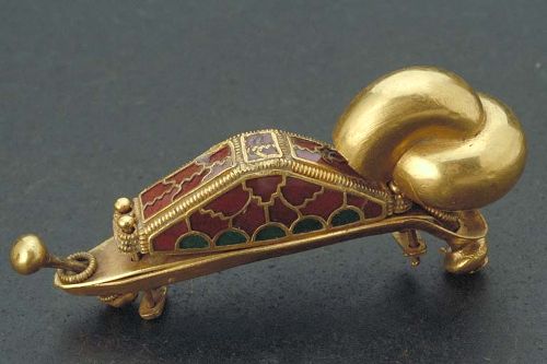 Bilden ovan är på en granatdekorerad svärdsknapp. Just denna, som hittades i Väsby i Uppland är av en speciell typ från folkvandrings- och vendeltid (dvs 400-750 e Kr). De kallas ringsvärd efter de maffiga dubbelringar som griper tag i varandra. De hade inget praktiskt syfte och arkeologerna tror att det kan ha varit en symbol för trohet och lojalitet. Själva utförandet och granatdekoren är starkt påverkad av det rådande modet i Frankerriket under denna tid.